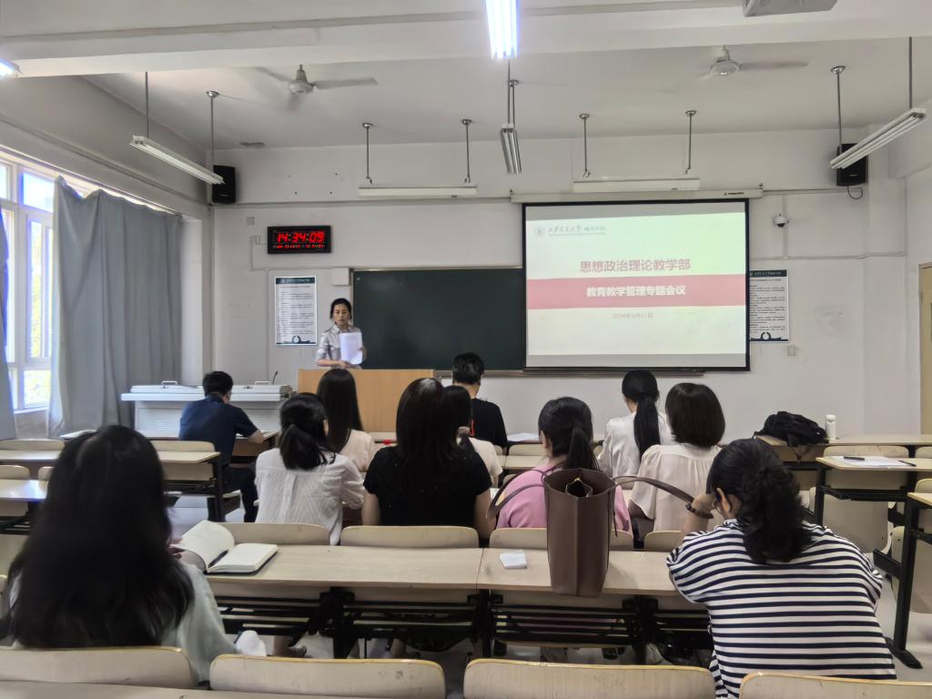为落实“陕西省教育厅办公室关于开展全省普通高校教育教学规范化管理专项行动的通知”精神,以及6月8日西安交通大学城市学院教育教学规范化管理专项行动启动会的会议精神,6月12日下午,思想政治理论教学部召开了教育教学规划化管理专项行动启动会,面向思政部全体教师开展学习教育活动。思政部主任陆卫明教授、副主任曹嘉伟副教授及其他无授课任务的教师参加了会议,会议由思政部主任助理常媛主持。