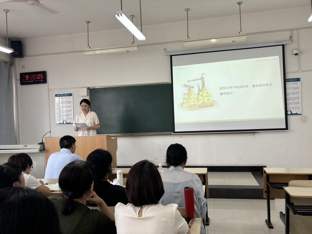 本次教学展示活动由《思想道德与法治》课程组李佳欣进行两个专题的授课展示。李佳欣以“人是什么?”这一根本问题为引,展开了对“人的本质属性”的深入探讨,她指出,人的本质属性并非简单的生物性,而是“一切社会关系的总和”。紧接着,李佳欣又展示了她的第二个主题“坚持依法治国与以德治国相结合”,分别从“德治法治,辩证统一”和“法安天下,德润人心”两个方面阐述了德治与法治的关系。