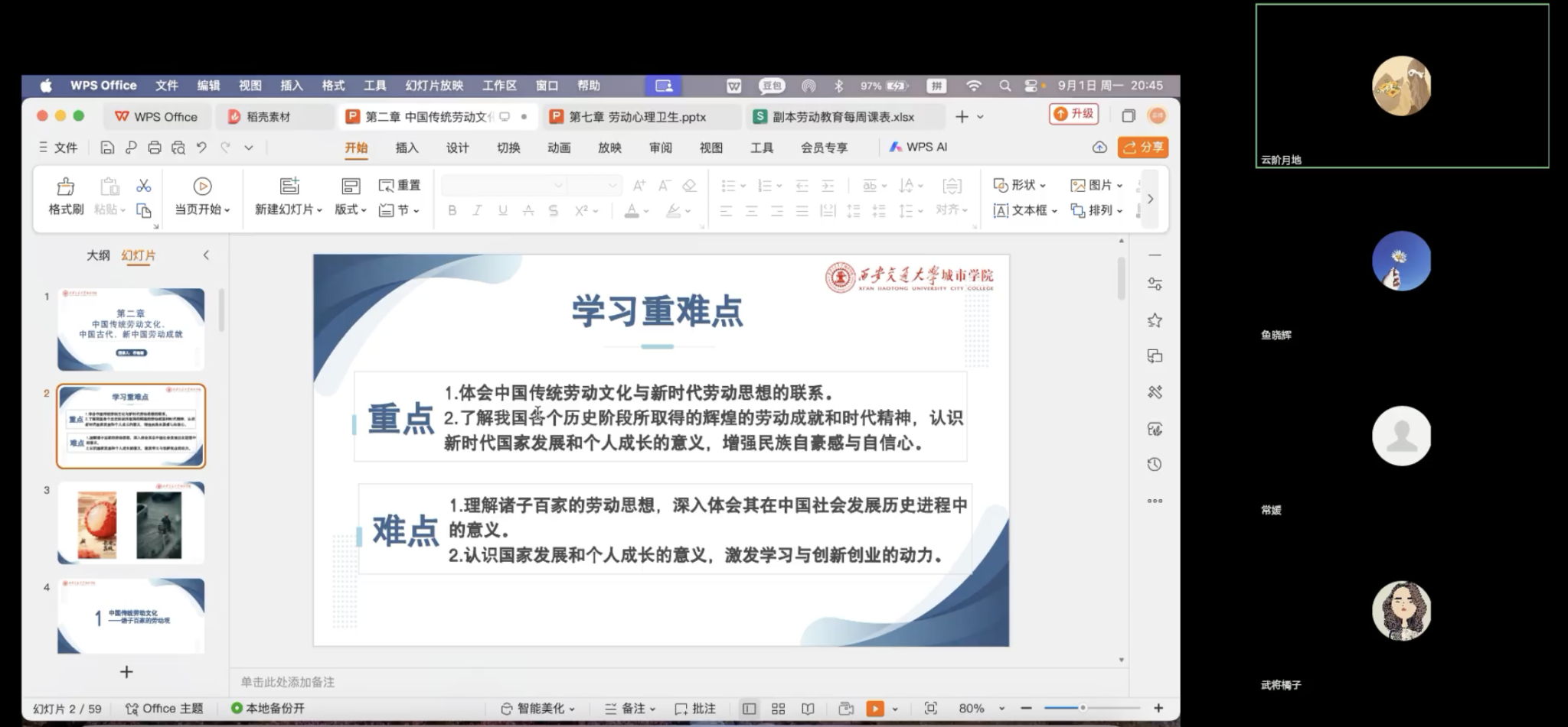 为做好新学期教学准备工作,保障课程教学质量,9月1日至2日,通识教育学院人文素养教研室组织召开《劳动教育》和《国家安全教育》课程线上集体备课会。院长助理常媛,教研室主任鱼晓辉及两门课程全体授课教师参加了此次备课会。