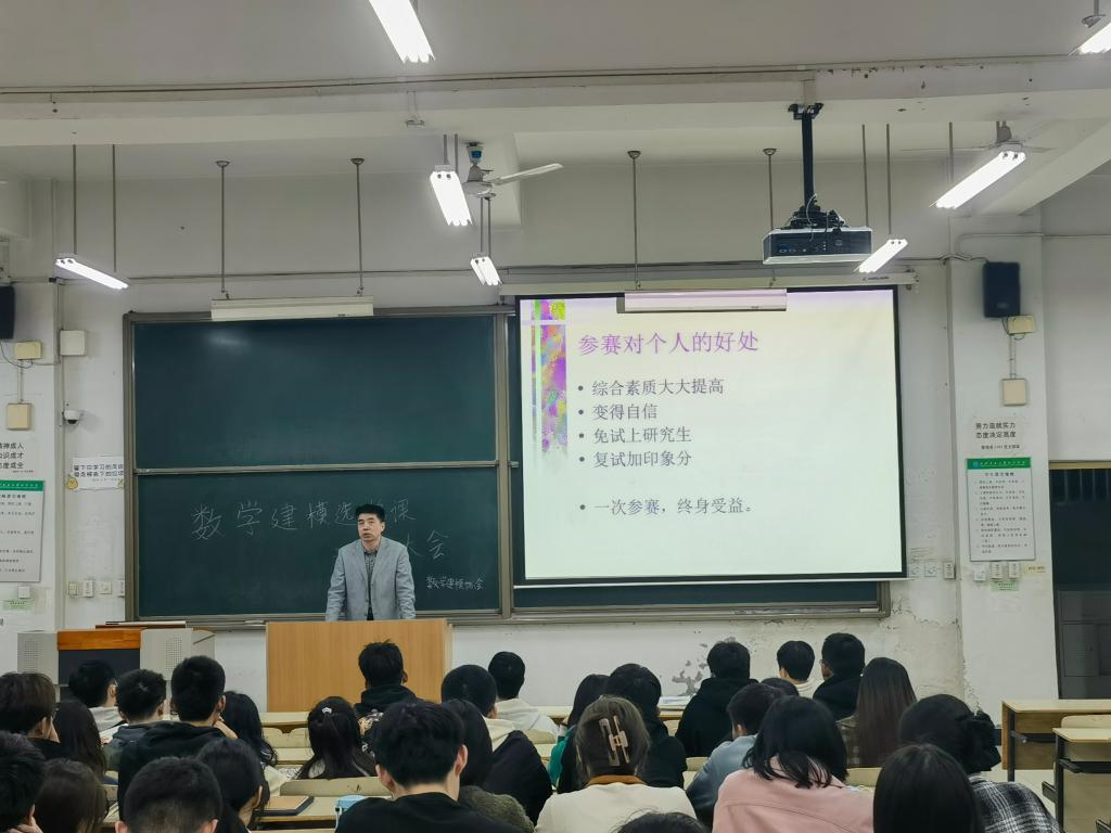 学院副院长朱旭强调了参加数学建模竞赛的重要性,通过讲述我院优秀数学建模参赛学生的经历,鼓励大家积极参加竞赛,应对挑战。通过参加数学建模竞赛,努力提升自己、挑战自己、展示自己。他指出作为一名参赛者,关键在于学习建模的过程,这是一个自主学习,增强知识运用能力的契机,鼓励学生一定不要放弃这样一个难得的学习机会。