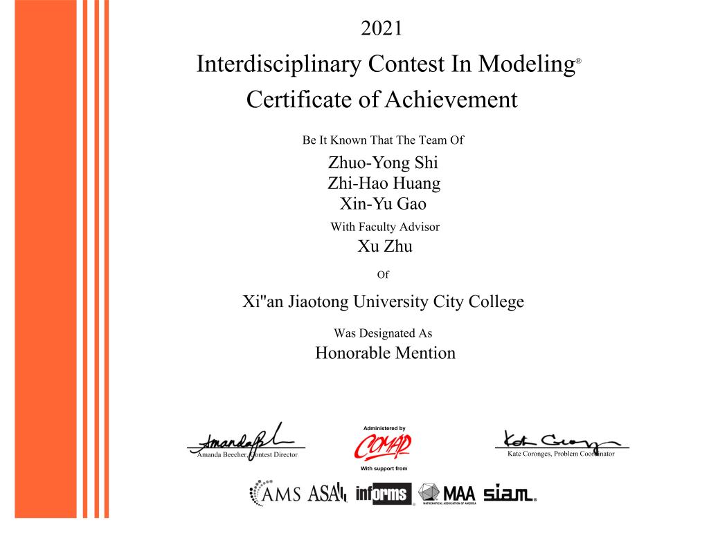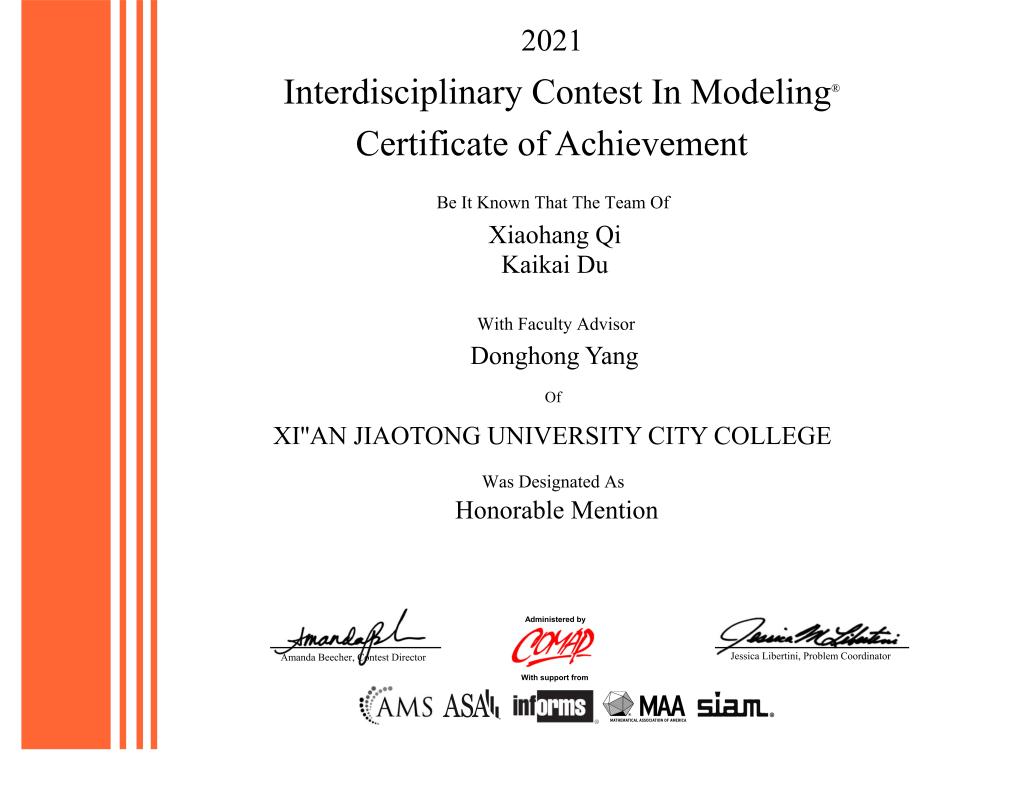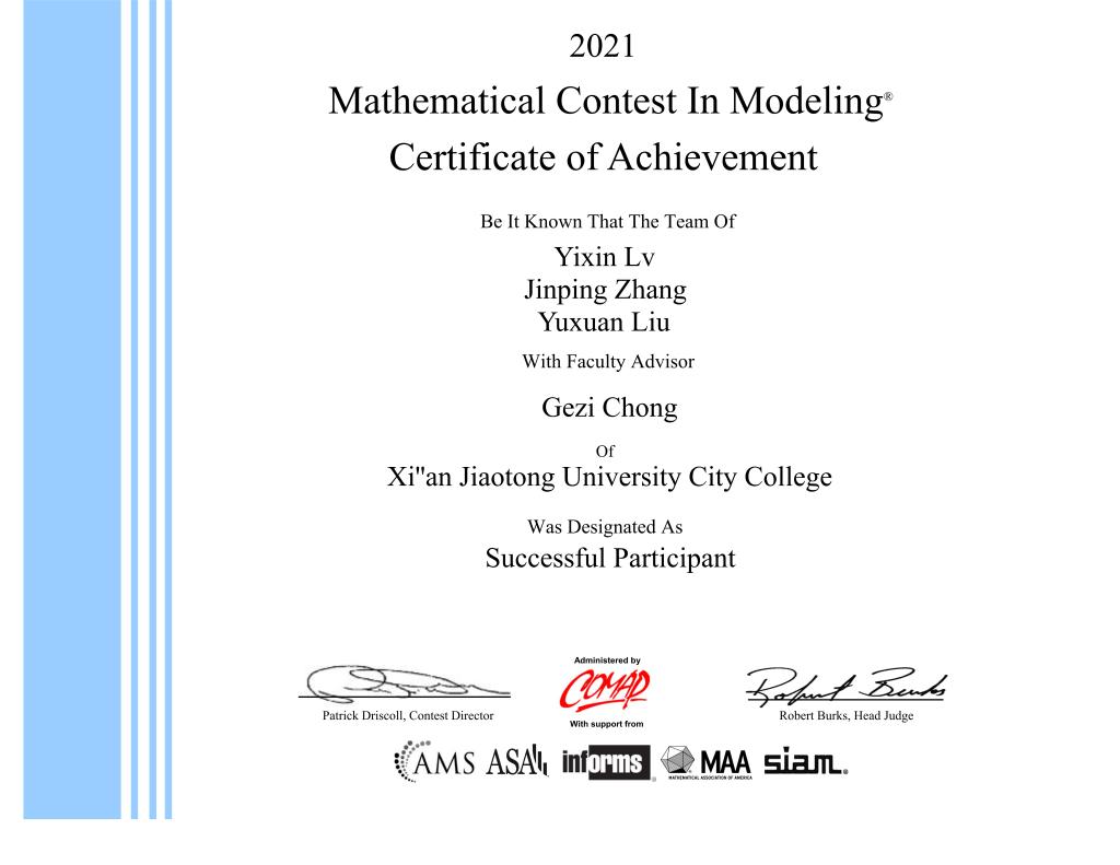 4月23日美国大学生数学建模竞赛官方网站(https://www.comap.com/)公布了2021年大学生数学建模比赛结果,西安交通大学城市学院首次组织参赛获二等奖(Honorable Mention)两项、优秀奖(Successful Participant)10项的佳绩。