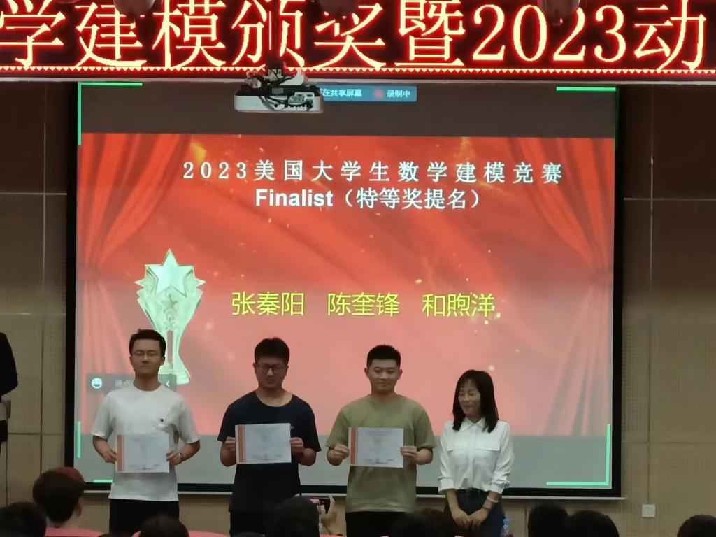 会议伊始,主持人宣读2022全国大学生数学建模竞赛及2023美国大学生数学建模竞赛获奖学生名单,与会领导及教师分别为获奖学生颁发获奖证书并合影留念。2022年全国大学生数学建模竞赛我院共获省一等奖5项、省二等奖9项,同时,学院荣获优秀组织工作奖;2023美国大学生数学建模竞赛获F(特等提名)奖1项、H(二等奖)奖4项、S(三等奖)奖28项。随后,优秀获奖队伍代表张秦阳同学分享了自己的参赛历程与获奖经验。