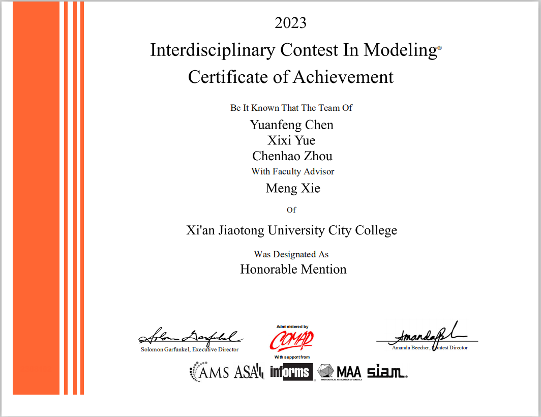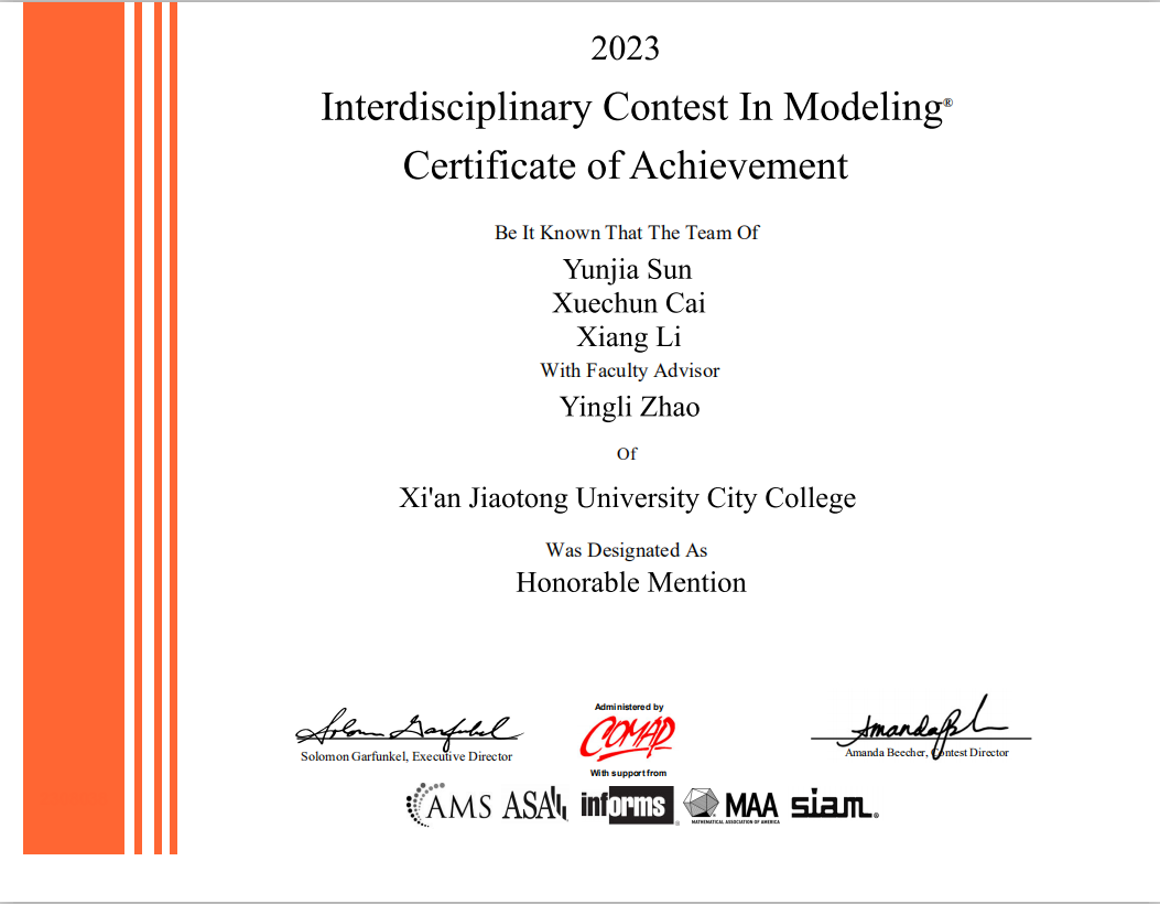 近日,2023年美国大学生数学建模竞赛评奖结果揭晓,西安交通大学城市学院参赛队伍实现成绩新突破,获Finalist(特等提名奖)1项,Honorable Mention(二等奖)4项,Successful Participants(三等奖)28项。本届大赛全校共有34支队伍报名参赛(本次获奖学生中计算机系占比59.18%,电信系占比32.65%)。