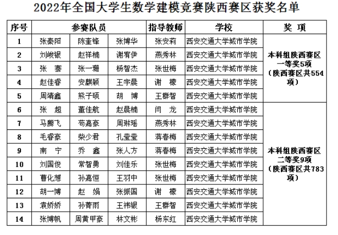近日,2022年全国大学生数学建模竞赛成绩揭晓,西安交通大学城市学院在本次竞赛中获佳绩。共获得本科组陕西赛区一等5项、陕西赛区二等奖9项;同时,西安交通大学城市学院获“陕西赛区优秀组织工作奖”。